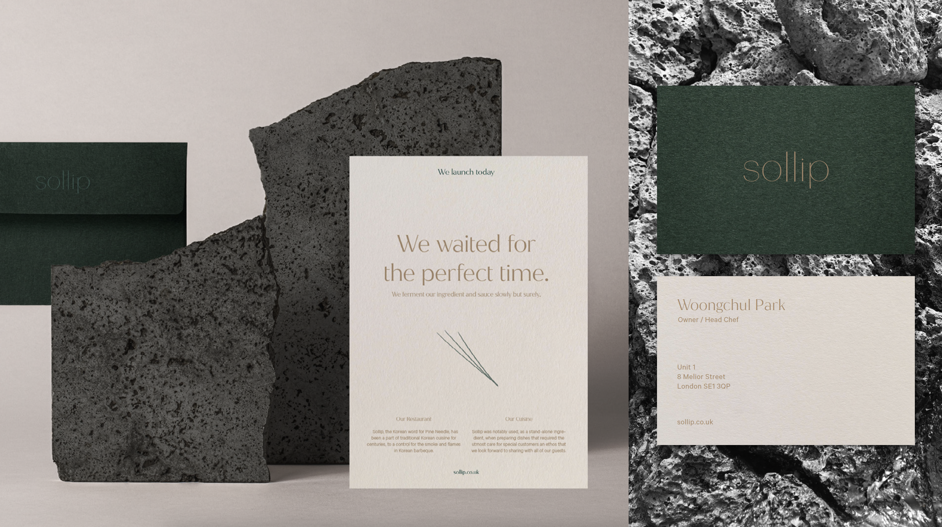 Solip is a fine-dining restaurant located in Bermondsey, London led by a Korean chef couple who were seeking to share their love through meticulously sourced seasonal ingredients. For its branding, Korean textures and pine tree needles represent a balance of Korean and European heritage.